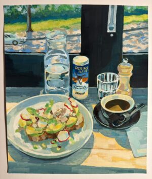久しぶりの水彩画(アクリル絵の具)は旅の思い出のランチ風景です。