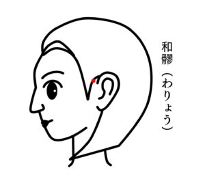 【和髎(わりょう)】…頭部、もみあげの後方、耳介の付け根の前方、動脈拍動部