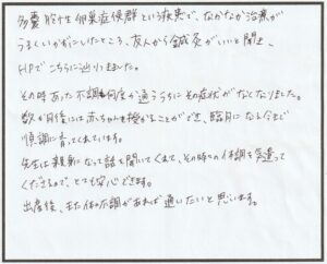 日野市の百草園駅前鍼灸院です。このようなお声をいただきました。