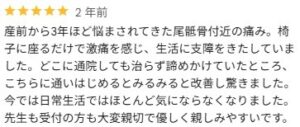 産前から3年ほど悩まされてきた尾骶骨付近の痛み。椅子に座るだけで激痛を感じ、生活に支障をきたしていました。どこに通院しても治らず諦めかけていたところ、こちらに通いはじめるとみるみると改善し驚きました。今では日常生活ではほとんど気にならなくなりました。