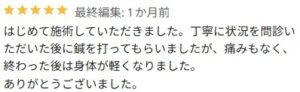 はじめて施術していただきました。丁寧に状況を問診いただいた後に鍼を打ってもらいましたが、痛みもなく、終わった後は身体が軽くなりました。