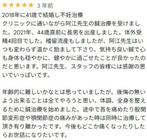 クリニックに通いながら阿江先生の鍼治療を受けました。2021年、44歳直前に長男を出産しました。体外受精4回目でした。稽留流産もしましたが、阿江先生はいつも変わらず温かく励まして下さり、気持ち良い鍼で心も身体も穏やかに、健やかに過ごせたことが良かったのだと思います。阿江先生、スタッフの皆様には感謝の思いでいっぱいです。