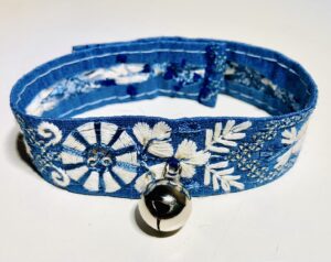 首輪の長さを計り、ホックを付ける場所を何度も確認して、鈴も付けて、チクチク手縫いで縫い付けました。