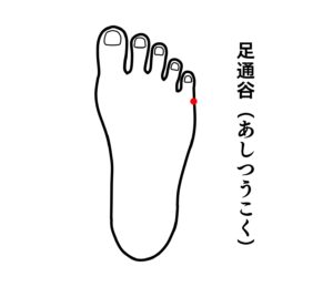 こんにちは 日野市、百草園駅前鍼灸院の中村です。 本日のツボを紹介いたします。 【足通谷(あしつうこく)】…足外側、第5中足指節関節の遠位陥凹部、赤白肉際 足通谷は、足の太陽膀胱経に属するツボ …