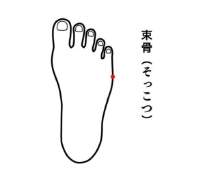 こんにちは 日野市、百草園駅前鍼灸院の中村です。 本日のツボを紹介いたします。 【束骨(そっこつ)】…足外側、第5中足指節関節の近位陥凹部、赤白肉際 束骨は、足の太陽膀胱経に属するツボです。 …