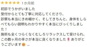 日野市の鍼灸院です。施術も全くつらくなくむしろリラックスして受けられ、この数ヶ月の辛さが本当に良くなりました‼️